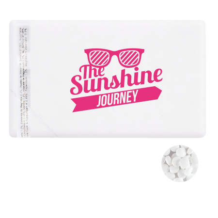 Mintdispenser Kreditkarte 78x48 mm mit ca. 8 gr. Minties zuckerfrei und Zutatenaufkleber