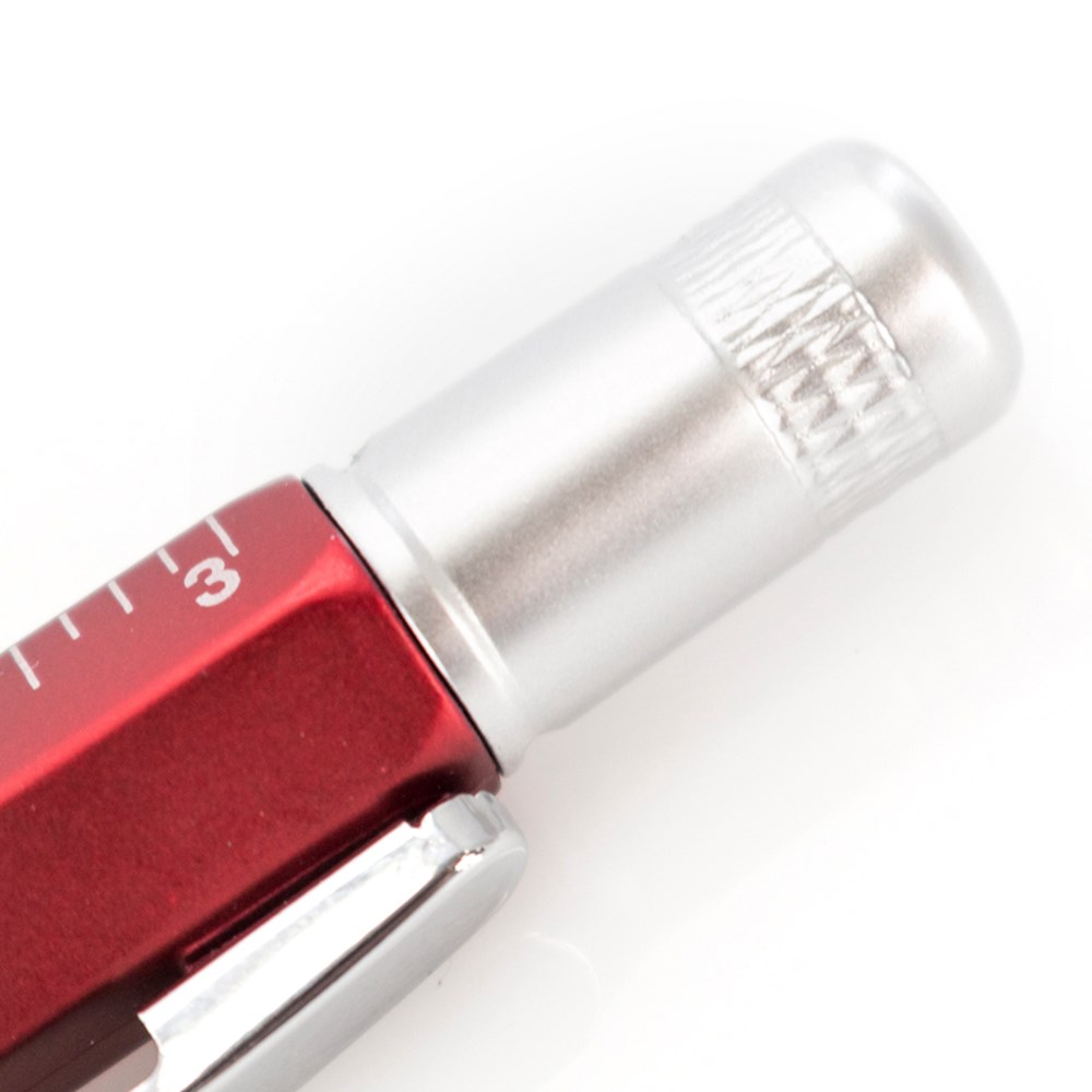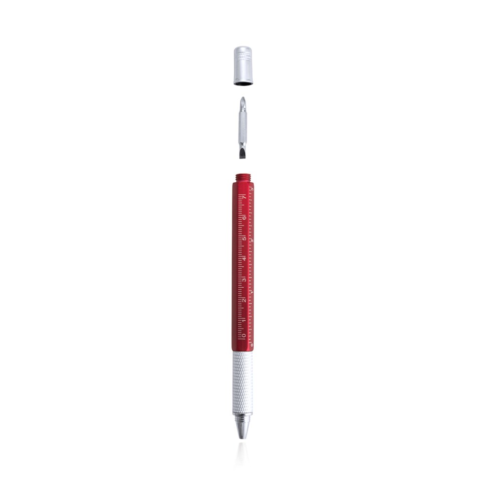 4-in-1 Multifunktions-Dreh-Kugelschreiber in verschiedenen Farben. Mit weichem Griff und integrierter Wasserwaage sowie Lineal mit Skala in Zentimetern und Zoll und Doppelkopf-Schraubendreher - schlitz- und kreuzförmig. Mit Metallclip und blauer Tinte.