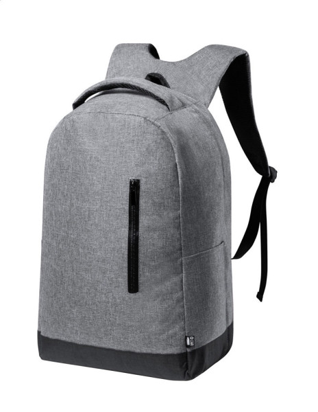 RPET-Rucksack mit Reißverschlussfächern, gepolstertem Laptop- (15") und Tabletfach (12"), Trolleygurt, ergonomischem Rücken- und Schultergurt. Mit verstecktem Anti-Diebstahl-Fach. Material: 600D RPET Polyester.