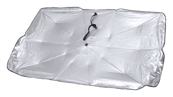 Zusammenklappbarer Auto-Sonnenschirm für die Windschutzscheibe mit Metallrahmen. In Polyestertasche.