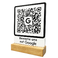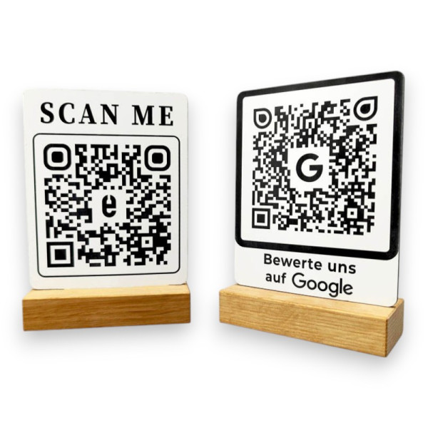 NFC Aufsteller mit beidseitigem QR-Code und integriertem NFC Chip für vielseitige Anwendungen.