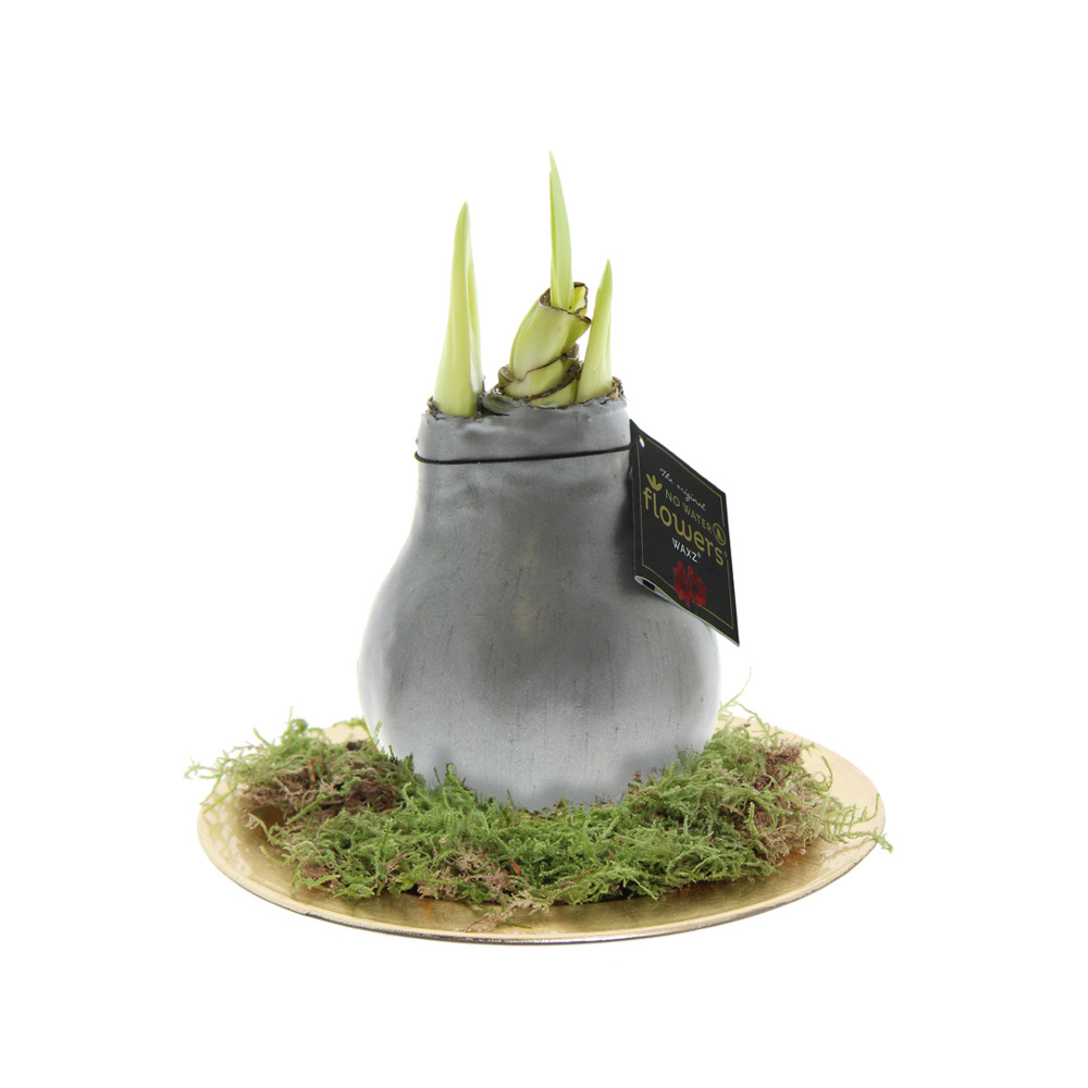 No Water Flowers® sind ein luxuriöses, wachsendes und blühendes Geschenk. Die lebenden No Water Flowers® sind bekannt für ihre einzigartigen handgefertigten Wachs-Amaryllis-Zwiebeln. Diese speziell ausgewählten und getesteten Amaryllis-Zwiebeln haben genug Energie, um ohne Wasser zu wachsen und zu blühen. Authentische No Water Flowers® haben relativ kurze Blütenstiele, fallen nicht um und blühen garantiert. Jede No Water Flowers® wird sorgfältig gereinigt und perfekt gewachst. Dadurch erhält die Blumenzwiebel ein zeitgemäßes und modisches Aussehen. Diese No Water Flowers® ist auf einer goldenen Schale platziert, was ihr ein luxuriöses Aussehen verleiht – ein tolles Geschenk für Ihre wichtigen Geschäftspartner. Außerdem sorgt dies dafür, dass die Amarylliszwiebel besonders stabil steht.