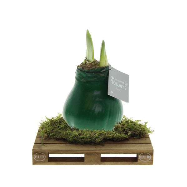 No Water Flowers® sind ein luxuriöses, wachsendes und blühendes Geschenk. Die lebenden No Water Flowers® sind bekannt für ihre einzigartigen handgefertigten Wachs-Amaryllis-Zwiebeln. Diese speziell ausgewählten und getesteten Amaryllis-Zwiebeln haben genug Energie, um ohne Wasser zu wachsen und zu blühen. Authentische No Water Flowers® haben relativ kurze Blütenstiele, fallen nicht um und blühen garantiert. Jede No Water Flowers® wird sorgfältig gereinigt und perfekt gewachst. Dadurch erhält die Blumenzwiebel ein zeitgemäßes und modisches Aussehen. Diese No Water Flowers® ist auf einer coolen Mini-Palette platziert, was ihr ein robustes und fantastisches Erscheinungsbild verleiht. Super cool für Bereiche wie die Logistikbranche. Außerdem sorgt dies dafür, dass die Amarylliszwiebel besonders stabil steht.