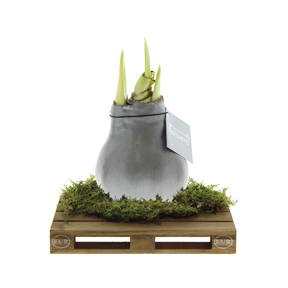 No Water Flowers® sind ein luxuriöses, wachsendes und blühendes Geschenk. Die lebenden No Water Flowers® sind bekannt für ihre einzigartigen handgefertigten Wachs-Amaryllis-Zwiebeln. Diese speziell ausgewählten und getesteten Amaryllis-Zwiebeln haben genug Energie, um ohne Wasser zu wachsen und zu blühen. Authentische No Water Flowers® haben relativ kurze Blütenstiele, fallen nicht um und blühen garantiert. Jede No Water Flowers® wird sorgfältig gereinigt und perfekt gewachst. Dadurch erhält die Blumenzwiebel ein zeitgemäßes und modisches Aussehen. Diese No Water Flowers® ist auf einer coolen Mini-Palette platziert, was ihr ein robustes und fantastisches Erscheinungsbild verleiht. Super cool für Bereiche wie die Logistikbranche. Außerdem sorgt dies dafür, dass die Amarylliszwiebel besonders stabil steht.