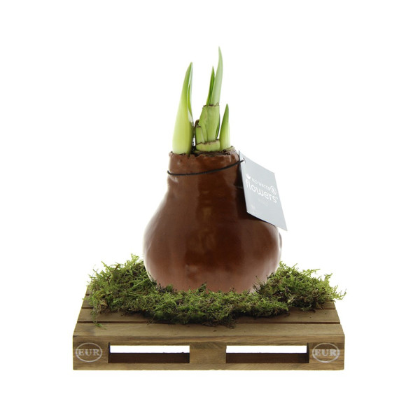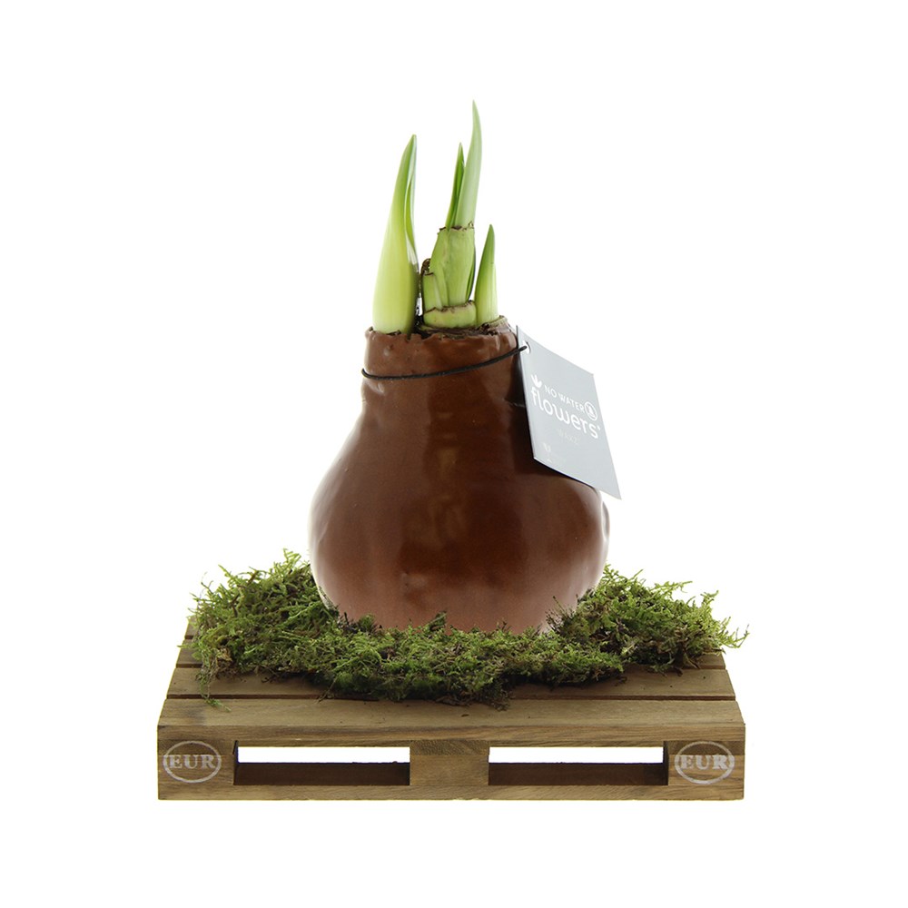 No Water Flowers® sind ein luxuriöses, wachsendes und blühendes Geschenk. Die lebenden No Water Flowers® sind bekannt für ihre einzigartigen handgefertigten Wachs-Amaryllis-Zwiebeln. Diese speziell ausgewählten und getesteten Amaryllis-Zwiebeln haben genug Energie, um ohne Wasser zu wachsen und zu blühen. Authentische No Water Flowers® haben relativ kurze Blütenstiele, fallen nicht um und blühen garantiert. Jede No Water Flowers® wird sorgfältig gereinigt und perfekt gewachst. Dadurch erhält die Blumenzwiebel ein zeitgemäßes und modisches Aussehen. Diese No Water Flowers® ist auf einer coolen Mini-Palette platziert, was ihr ein robustes und fantastisches Erscheinungsbild verleiht. Super cool für Bereiche wie die Logistikbranche. Außerdem sorgt dies dafür, dass die Amarylliszwiebel besonders stabil steht.