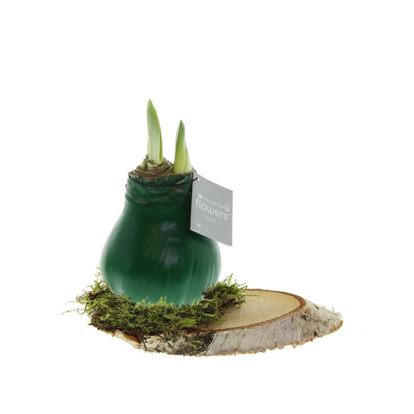 No Water Flowers® sind ein luxuriöses, wachsendes und blühendes Geschenk. Die lebenden No Water Flowers® sind bekannt für ihre einzigartigen handgefertigten Wachs-Amaryllis-Zwiebeln. Diese speziell ausgewählten und getesteten Amaryllis-Zwiebeln haben genug Energie, um ohne Wasser zu wachsen und zu blühen. Authentische No Water Flowers® haben relativ kurze Blütenstiele, fallen nicht um und blühen garantiert. Jede No Water Flowers® wird sorgfältig gereinigt und perfekt gewachst. Dadurch erhält die Blumenzwiebel ein zeitgemäßes und modisches Aussehen. Diese No Water Flowers® ist auf einer natürlichen Birkenholzscheibe mit einer Schicht natürlichen Mooses platziert, was dem Ganzen ein gemütliches Aussehen verleiht. Außerdem sorgt dies dafür, dass die Amarylliszwiebel besonders stabil steht.