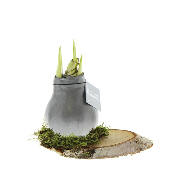No Water Flowers® sind ein luxuriöses, wachsendes und blühendes Geschenk. Die lebenden No Water Flowers® sind bekannt für ihre einzigartigen handgefertigten Wachs-Amaryllis-Zwiebeln. Diese speziell ausgewählten und getesteten Amaryllis-Zwiebeln haben genug Energie, um ohne Wasser zu wachsen und zu blühen. Authentische No Water Flowers® haben relativ kurze Blütenstiele, fallen nicht um und blühen garantiert. Jede No Water Flowers® wird sorgfältig gereinigt und perfekt gewachst. Dadurch erhält die Blumenzwiebel ein zeitgemäßes und modisches Aussehen. Diese No Water Flowers® ist auf einer natürlichen Birkenholzscheibe mit einer Schicht natürlichen Mooses platziert, was dem Ganzen ein gemütliches Aussehen verleiht. Außerdem sorgt dies dafür, dass die Amarylliszwiebel besonders stabil steht.