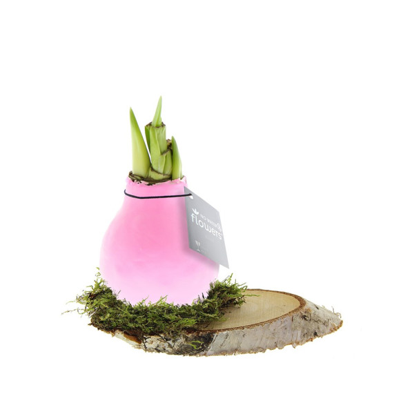 No Water Flowers® sind ein luxuriöses, wachsendes und blühendes Geschenk. Die lebenden No Water Flowers® sind bekannt für ihre einzigartigen handgefertigten Wachs-Amaryllis-Zwiebeln. Diese speziell ausgewählten und getesteten Amaryllis-Zwiebeln haben genug Energie, um ohne Wasser zu wachsen und zu blühen. Authentische No Water Flowers® haben relativ kurze Blütenstiele, fallen nicht um und blühen garantiert. Jede No Water Flowers® wird sorgfältig gereinigt und perfekt gewachst. Dadurch erhält die Blumenzwiebel ein zeitgemäßes und modisches Aussehen. Diese No Water Flowers® ist auf einer natürlichen Birkenholzscheibe mit einer Schicht natürlichen Mooses platziert, was dem Ganzen ein gemütliches Aussehen verleiht. Außerdem sorgt dies dafür, dass die Amarylliszwiebel besonders stabil steht.