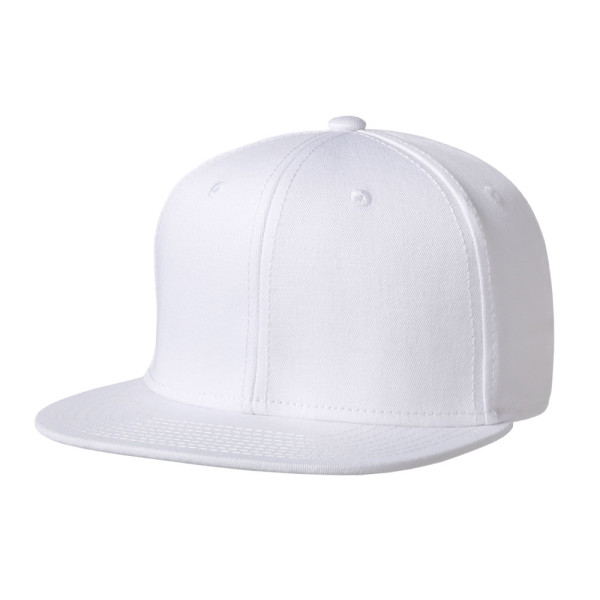 6 panel Cap mit Frontfütterung. Flat visor. Plastik Verschluss. Ausgeführt in cotton twill