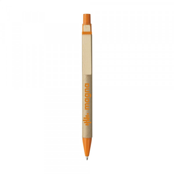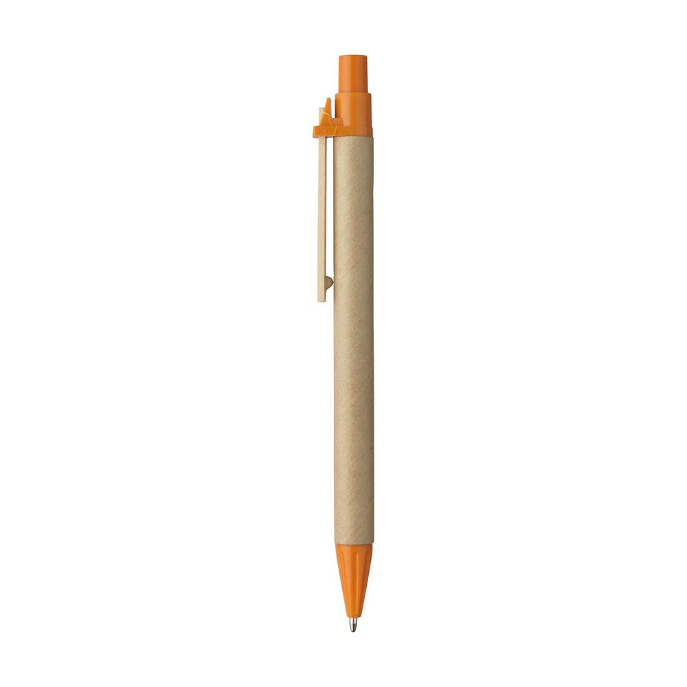 Blauschreibender Kugelschreiber mit FSC Recycled zertifiziert kartongehäus und eingefärbten Kunststoffakzenten.