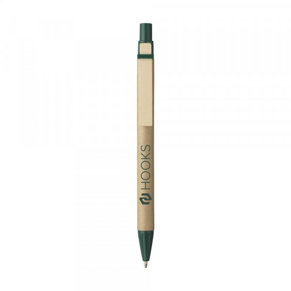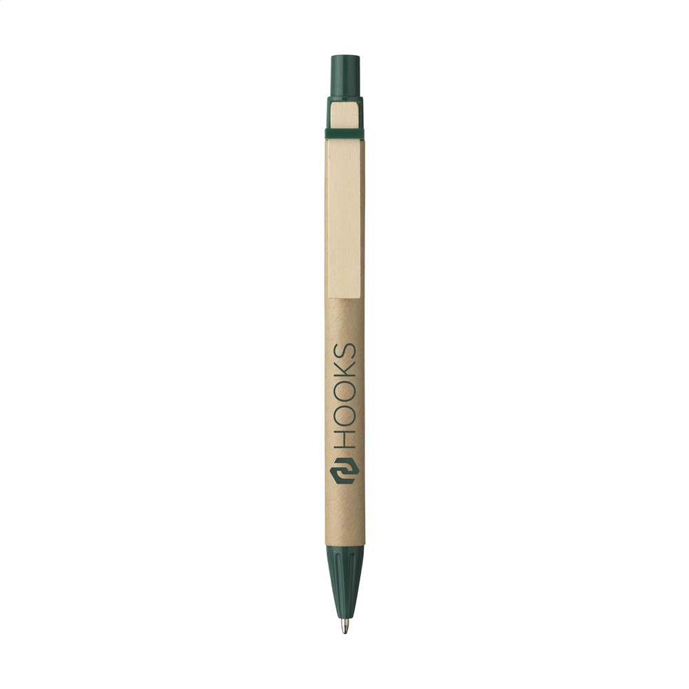 Blauschreibender Kugelschreiber mit FSC Recycled zertifiziert kartongehäus und eingefärbten Kunststoffakzenten.
