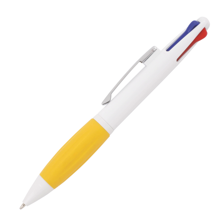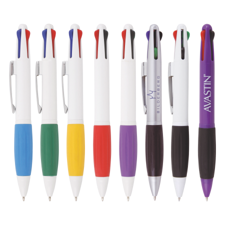Der PAXI 4-Farben-Kugelschreiber Peekay ist ein praktischer Kunststoffstift mit Metallclip, der in Schwarz, Rot, Blau und Grün schreibt.
