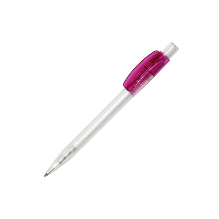 Maxema Kugelschreiber PIXEL PX40 FROST NEUTRAL mit gefrostetem transparentem Gehäuse, glänzend farbigem transparentem Clip und glänzend transparentem Drücker. Ausgestattet mit einer X-20 Mine mit blauer Dokumental Tinte für bis zu 2.000 Meter Schreibvergnügen. Erhältlich in nicht weniger als 9 Farben und ab 2.000 Stück farblich kombinierbar.