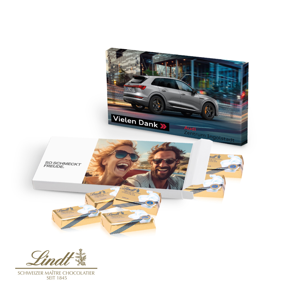 Begehrter Topseller! Erstklassige Preis-Leistung und Top-Markenqualität stehen bei diesem Produkt im Mittelpunkt. Ideal als Geschenk für zwischendurch oder zum Versenden. Die Verpackung ist rundum individuell bedruckbar. Produktdetails: Feine Schokolade von Lindt, verpackt in einer individuellen Werbekartonage. Nachhaltigkeit: Für jede Bestellung mit uns wird ein Baum über GROW MY TREE gepflanzt. Wir verwenden FSC® zertifizierten Karton aus nachhaltiger Forstwirtschaft und anderen kontrollierten Quellen.