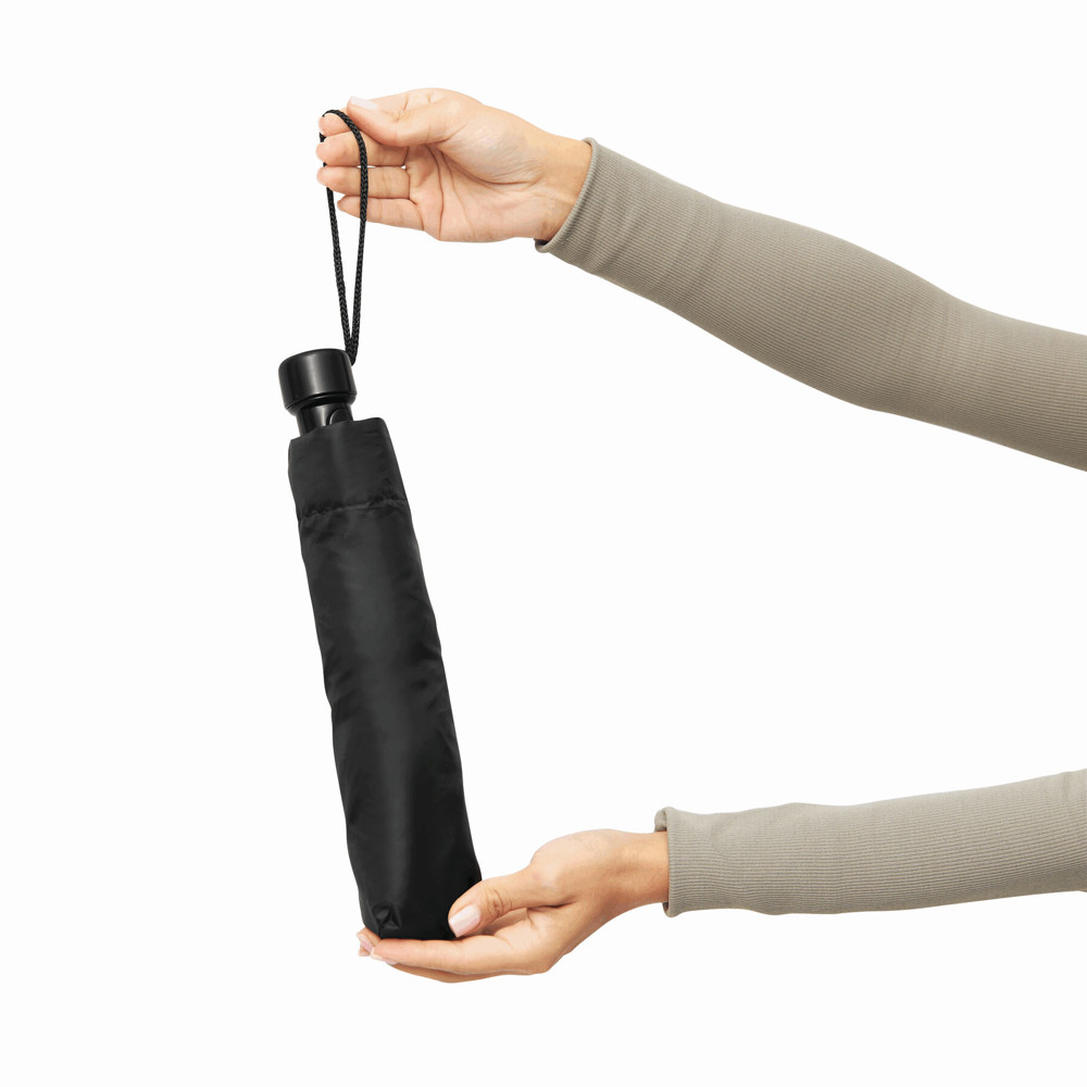 Automatik-Taschenschirm PRIMA, im farblich abgestimmten Futteral: 3-teiliger Metallstock, Metallspeichen und -tips, schwarzer Kunststoffknauf mit farblich abgestimmter Automatik-Auslösetaste und Handschlaufe, Polyester-Bespannung und Schließband mit Klettverschluss
