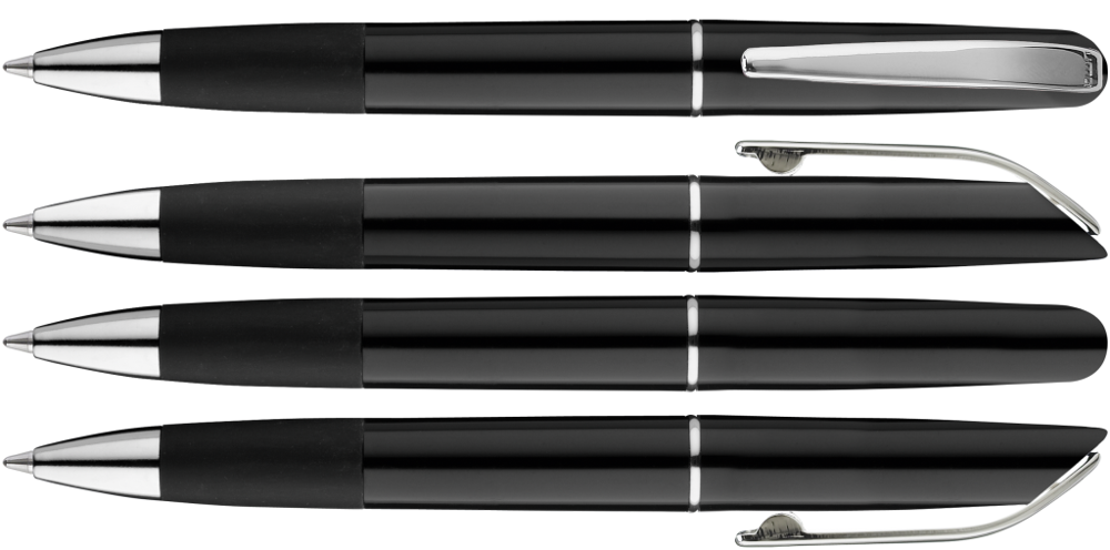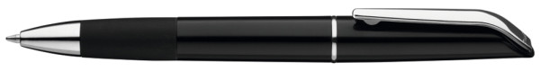 Drehkugelschreiber mit gedeckt glänzendem Gehäuse und Gummigriffzone in schwarz. Metallclip, Zierring und Metallspitze glanzverchromt.