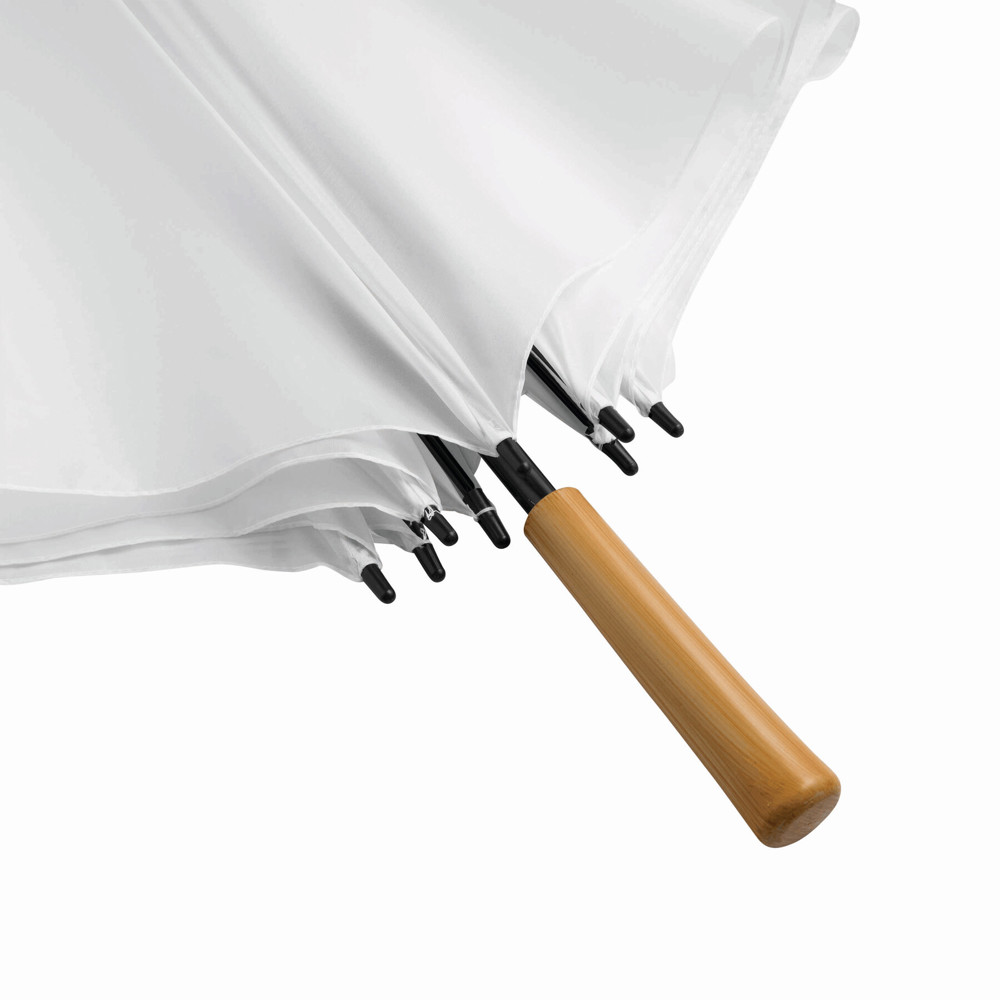 Golfschirm RAINDROPS: Metallstock und Doppelmetallspeichen, Kunststofftipps, Griff in Holz-Optik, Polyester-Bespannung, Schließband mit Klettverschluss
