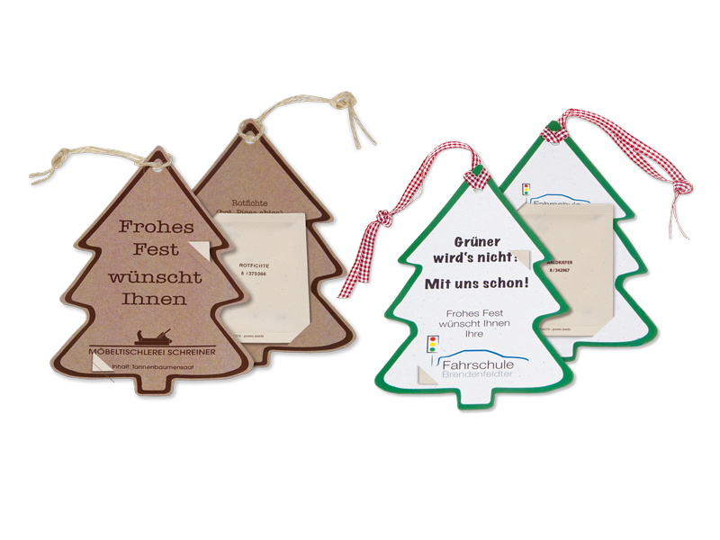 Mit Ready to grow-Samenanhängern können Sie Ihre Weihnachtsgrüße überraschend anders verpacken. Die Hängekärtchen in Tannenbaum-Kontur werden vierfarbig mit Ihrer Werbung bedruckt. Auf der Rückseite befindet sich ein Samentütchen mit Tannenbaumsaat. *** INDIVIDUELLE GESTALTUNG DES ANHÄNGERS MÖGLICH. Die gewünschte Saatsorte können Sie frei wählen. Saatsorten im Standard-Innentütchen: Rotfichte (individuelle Saatanfragen möglich)