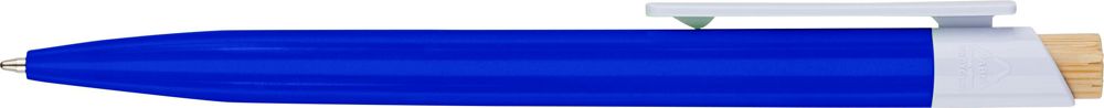 Recycelter ABS-Kugelschreiber mit Bambus-Druckknopf und weißem Clip. Mit recyceltem Logo im In-Mould-Verfahren. Ungefähre Schreiblänge 600 Meter. Blaue Tinte.