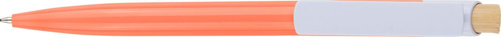 Recycelter ABS-Kugelschreiber mit Bambus-Druckknopf und weißem Clip. Mit recyceltem Logo im In-Mould-Verfahren. Ungefähre Schreiblänge 600 Meter. Blaue Tinte.