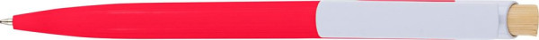 Recycelter ABS-Kugelschreiber mit Bambus-Druckknopf und weißem Clip. Mit recyceltem Logo im In-Mould-Verfahren. Ungefähre Schreiblänge 600 Meter. Blaue Tinte.