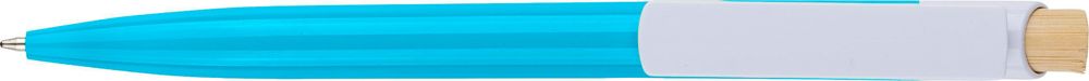 Recycelter ABS-Kugelschreiber mit Bambus-Druckknopf und weißem Clip. Mit recyceltem Logo im In-Mould-Verfahren. Ungefähre Schreiblänge 600 Meter. Blaue Tinte.
