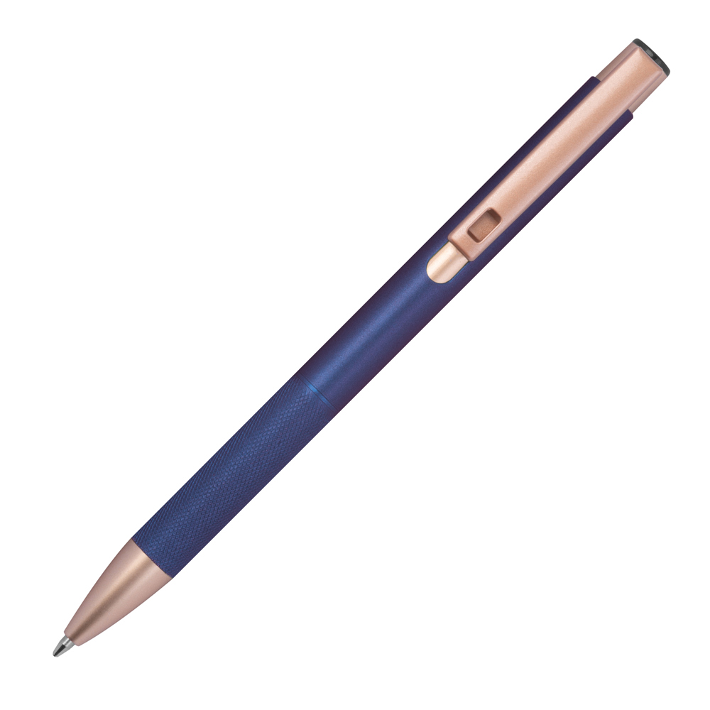 Unser Kugelschreiber aus recyceltem Aluminium überzeugt durch seine elegante Optik mit rosé goldenen Applikationen und einer Griffzone in edler Diamantoptik. Die blau schreibende Großraummine sorgt für ein angenehmes Schreibgefühl – ideal für den täglichen Einsatz im Büro, unterwegs oder als hochwertiges Werbegeschenk. Ein Statement für Nachhaltigkeit und Stil.