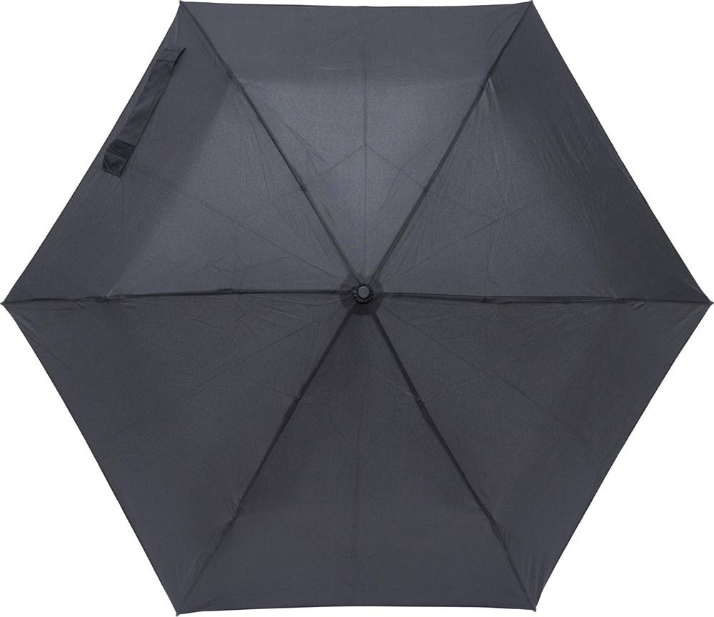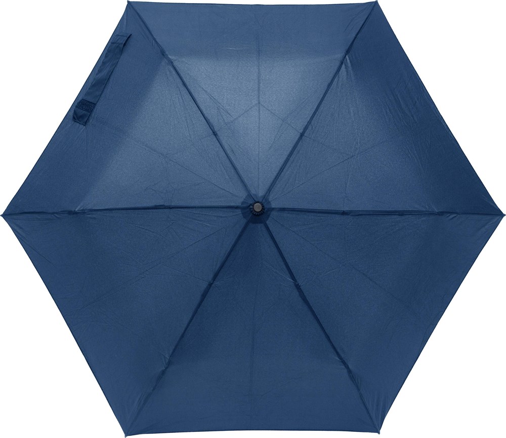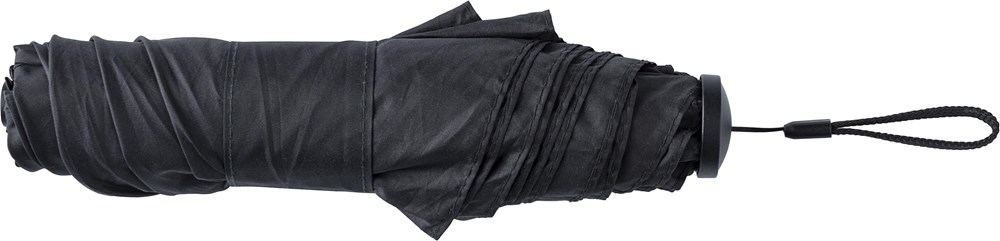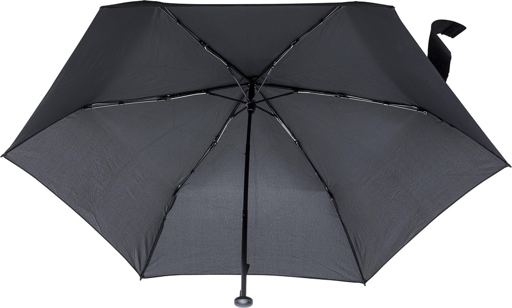 Faltbarer Taschenschirm mit einer Bespannung aus Pongee (190T), einen Schaft, Gestell und Handgriff aus Metall. Mit zusätzlicher Tasche aus Nylon.