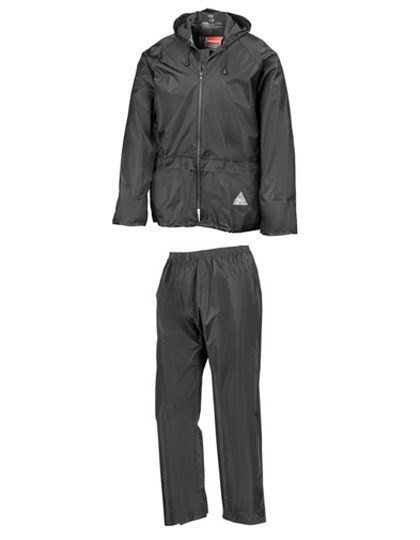 Wind- und wasserdicht (2.000 mm) | Außen: 190T 100% Polyester mit StormDri 2000 Beschichtung | Schweres Material, versiegelte Nähte | Kapuze mit Klettverschluss, durchgehender Reißverschluss vorne | Zwei geräumige Taschen an der Vorderseite der Jacke und zwei Eingriffe zu den Taschen der darunter getragenen Hose | Innenliegende Bündchen, Rückseite mit Netzlüftung | Verstellbarer Kordelzug im Bund der Jacke | Elastischer Hosenbund | Beinabschluss verstellbar durch Druckknopf | Reißverschluss-Beutel zum Verstauen | Sicherheitsdreiecke vorne und hinten mit reflektierenden Materialien