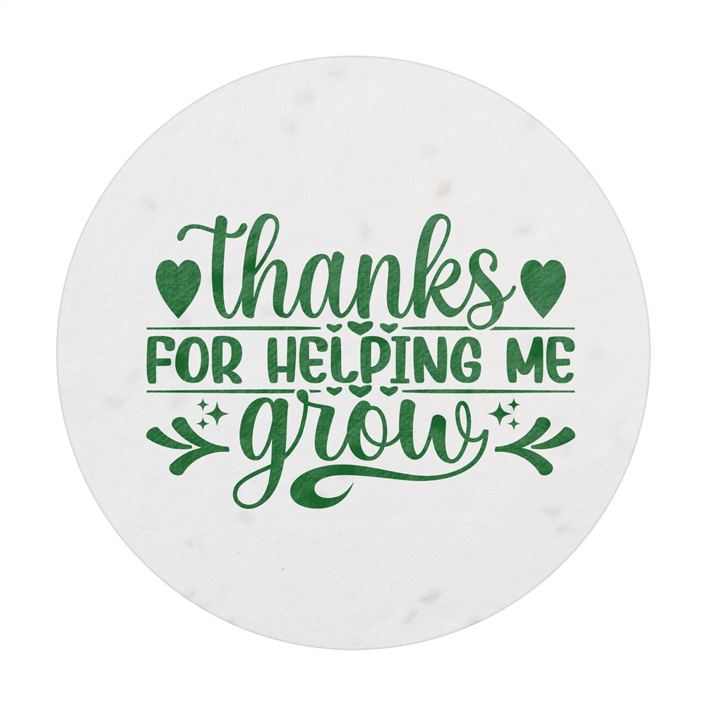 Runde Untersetzer aus biologisch abbaubarem Papier mit Blumensamen (200 g/m² Samenpapier). Inklusive vollfarbigem Druck auf einer Seite, den Sie vollständig an Ihre Marke oder Botschaft anpassen können. Ein (vollfarbiger) Druck auf der zweiten Seite ist gegen Mehrpreis möglich. Die Blumensamen-Mischung besteht aus: Godetia, Mesembrantium, Petunia, Gypsophila, Antirrhinum, Allysum Bentany. Nach Gebrauch können die Untersetzer in die Erde gepflanzt werden, wo sie zu Blumen heranwachsen. Verleihen Sie Ihrer Marke etwas Farbe! Durch die Verarbeitung von Samen und recycelten Materialien sind kleine Unregelmäßigkeiten im Material sichtbar. Made in Europe.