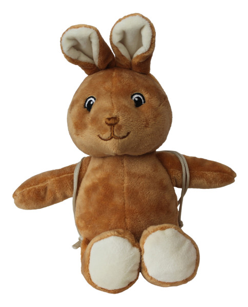 Osterhase Hanni mit Baumwoll-Rucksack. Frühling zum Kuscheln: Osterhäsin Hanni aus recyceltem rPET-Plüsch bringt einen abnehmbaren Baumwoll-Rucksack mit – perfekt für kleine Überraschungen wie Schokoeier oder Botschaften. Veredelt werden kann entweder das dezente Zusatzlabel oder der Rucksack selbst – für eine Werbebotschaft mit Herz und Stil. Weich, nachhaltig und voller Frühlingsfreude – ein Highlight fürs Osternest oder als emotionaler Werbeträger.