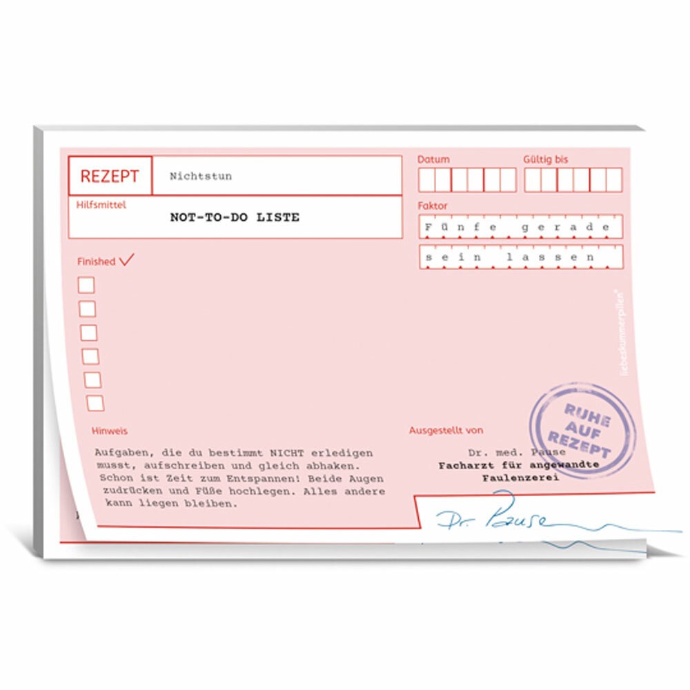 Dabei hilft die Not-to-do-Liste. Aufgaben die bestimmt NICHT erledigt werden müssen, aufschreiben und gleich abhaken. Schon ist Zeit zum Entspannen!