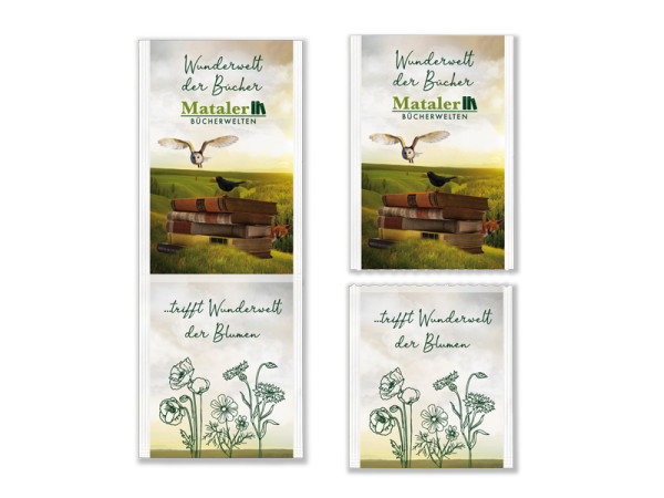 Der ideale Werbeträger für z.B. Zeitschriften- u. Buchverlage. Dieses kreative Produkt besteht aus einer Samentüte und einem Lesezeichen. Beide sind durch eine Perforation leicht voneinander zu trennen. *** INDIVIDUELLE GESTALTUNG DES LESEZEICHENS MÖGLICH. Für spezielle Saatsorten kann ein Aufpreis entstehen. Einfache Saatsorten: Margerite, Sonnenblume, Vergissmeinnicht, Kresse, Basilikum, Rucola, Petersilie, Möhren, Radieschen (ohne Aufpreis) | Spezielle Saatsorten: Bunte Blumenwiese, Wildblumen, Bienenblumen, Chili oder Tomate (mit Aufpreis) | weitere Auswahl aus ca. 2.500 Saatsorten möglich