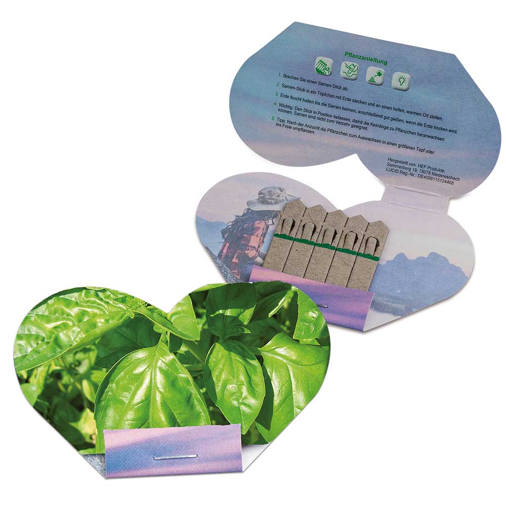 Frühlings- und Sommergrüße oder einfach von Herzen Danke sagen! Anlässe für einen Werbegruß gibt es viele. Mit den Samen-Sticks gelingt einemdabei noch ein Überraschungseffekt: Denn im flachen Briefchen aus Papier erwarten einen keine Streichhölzer, sondern Werbegrüße mit Samen, die sich durch die flache Form und das geringe Gewicht perfekt als Selfmailer eignen. Auf fünf kleine Sticks aus Papier werden wahlweise Basilikum, Fichtensamen, Wildblumen- oder Kräutermischung aufgebracht. Wird ein Stick in die Erde gesteckt und gegossen, sprießt schnell ein kleines Pflänzchen. In Herzform, Standard-Briefchen oder als lustige Biene können sie je nach Werbethema die Botschaft durch die Form unterstützen und individuell angepasst werden. Das Briefchen selbst ist auf vier Seiten individuell gestaltbar. Eine Pflanzanleitung komplettiert das Werbemittel.