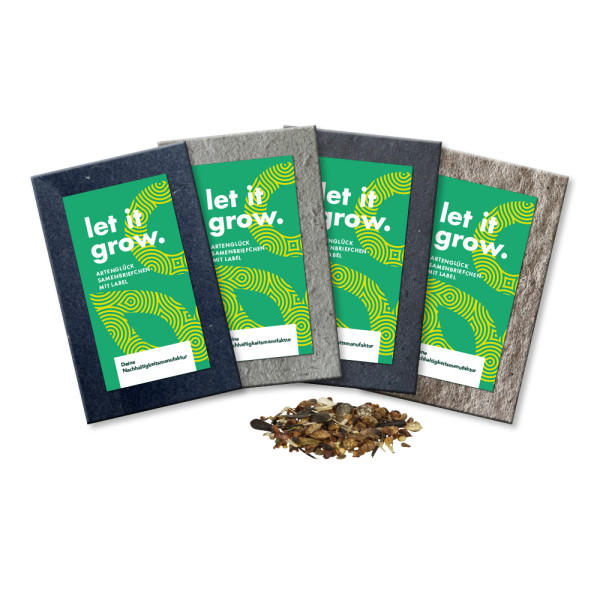 Das Samenbriefchen „Artenglück 2nd Matter“ vereint Nachhaltigkeit und Werbewirkung. Der Umschlag besteht aus 2nd Matter Papier – einem hochwertigen Recyclingmaterial aus industriellen Reststoffen wie Jeansfasern, Teeblättern, Kaffeeschalen oder Zitronengras. Gefüllt mit der bewährten Artenglück-Hausmischung bietet es Lebensraum für Bienen & Co. Individuell gestaltbar mit Label auf der Vorderseite und Pflichtangaben auf der Rückseite. Ideal als grüner Streuartikel.