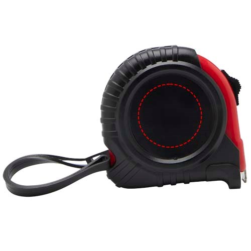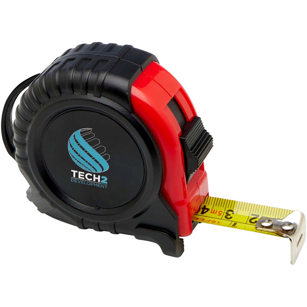 5 Meter Maßband mit Zentimeter- und Inch-Anzeige, dazu ein praktischer Gürtelclip für einfaches Mitnehmen.