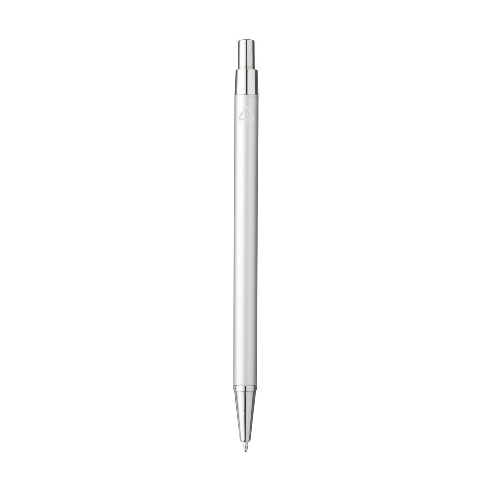 Blauschreibender Kugelschreiber mit schlankem Halter aus Aluminiumschrott. Der Halter dieses Kugelschreibers besteht zu 85% aus zertifiziertem, recyceltem Aluminium. Mit stabilem Metallclip und Druckknopf. Durch die Verwendung von recyceltem Aluminium werden bei der Herstellung dieses Produkts weniger neue Rohstoffe verwendet. Das bedeutet weniger Energieverbrauch und weniger Wasserverbrauch.