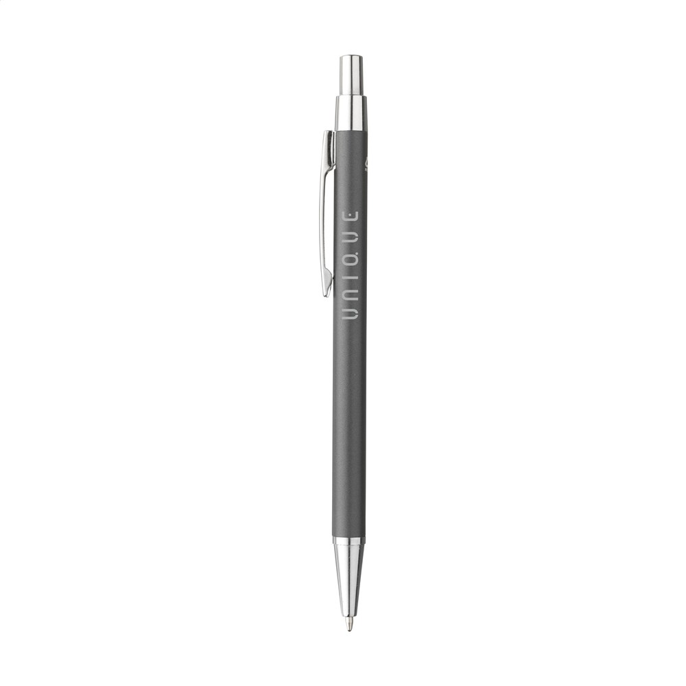 Blauschreibender Kugelschreiber mit schlankem Halter aus Aluminiumschrott. Der Halter dieses Kugelschreibers besteht zu 85% aus zertifiziertem, recyceltem Aluminium. Mit stabilem Metallclip und Druckknopf. Durch die Verwendung von recyceltem Aluminium werden bei der Herstellung dieses Produkts weniger neue Rohstoffe verwendet. Das bedeutet weniger Energieverbrauch und weniger Wasserverbrauch.