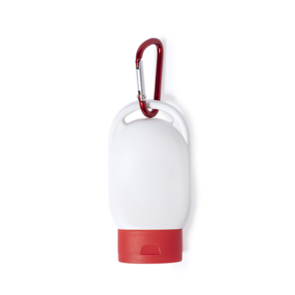 Sonnenschutzcreme Faktor 30. Präsentiert in einer praktischen 30ml-Flasche und mattierter Oberfläche. In vielen Farben erhältlich, mit passendem Transportkarabiner.