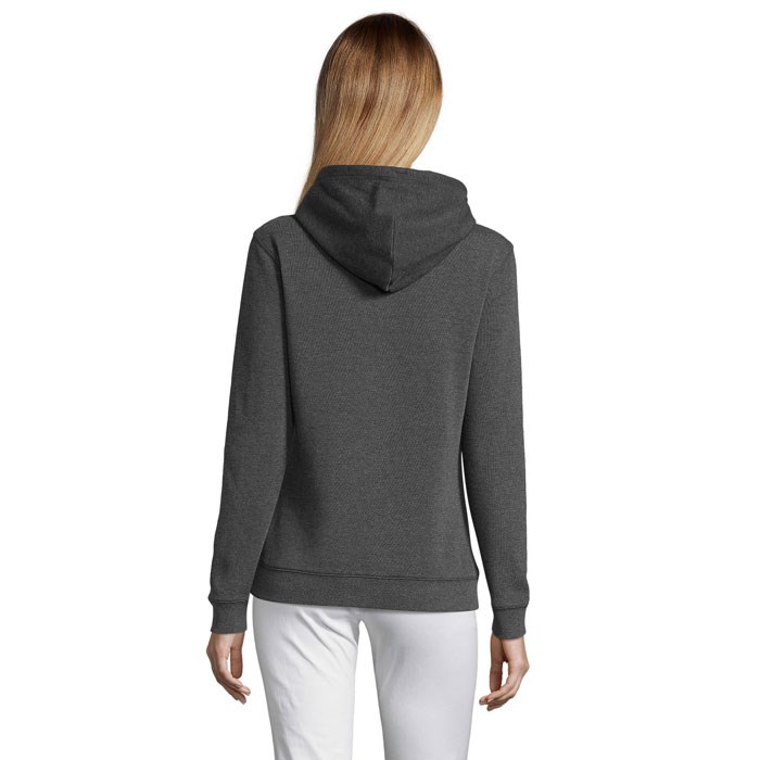 SOL'S SPENCER Damen Sweater 280g. Kängurutasche. Seitennähte. Gefütterte Kapuze mit Zugband. Feinrippeinfassung an Ärmelbündchen und Saum 2x2. Halbmondpasse auf der Krageninnenseite. Nackenband auf der Krageninnenseite. Material: 80% Baumwolle Ringspun - 20% Polyester. Innen angeraut. Außenmaterial 100% Baumwolle. OEKO-TEX®. Verkauf nur inklusive Werbeanbringung.
