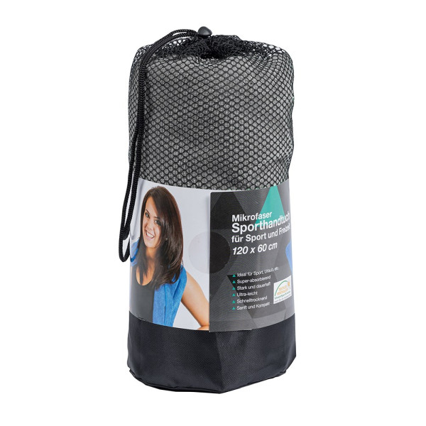 Mittelgroßes Handtuch 60x120 cm aus 85% Polyester und 15% Polyamid (Mikrofaser-Frottee 280 g/m²), verpackt in einem schwarzen Netzbeutel mit Infobanderole, die auf Wunsch selbst gestaltet werden kann.