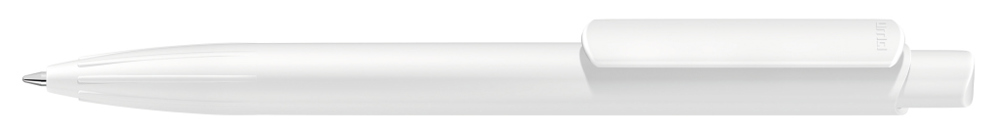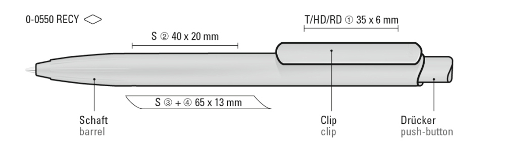 Druckkugelscheiber mit gedeckt mattem Gehäuse, Clip und Drücker aus recyceltem ABS-Kunststoff. Eingelassene Griffzone.