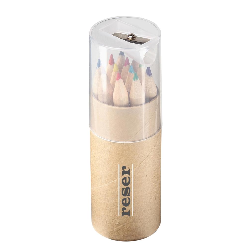 Handliches 2in1-Set mit 12 kurzen, unlackierten Holz-Buntstiften im Pappzylinder mit transparentem Kunststoffdeckel und integriertem Spitzer.