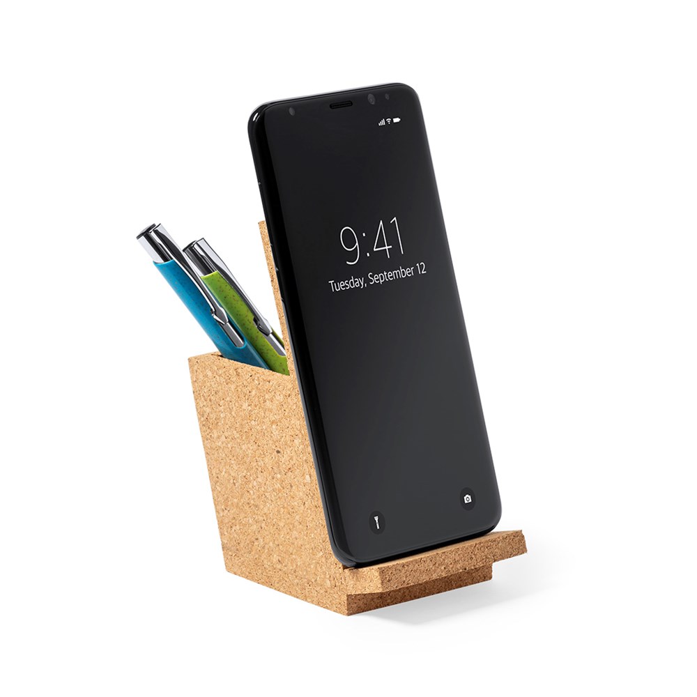 Linie "Natur" Stifthalter mit integriertem Smartphone-Halter. Hergestellt aus Kork, um die Verwendung von natürlichen Rohstoffen zu fördern, und präsentiert in einer attraktiven Öko-Design-Box.