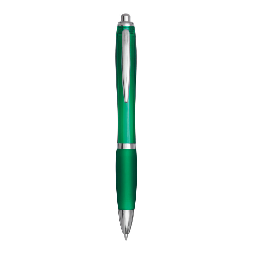 Kugelschreiber SWAYRABS: mit Schaft in taillierter Form aus recyceltem Kunststoff, gummierter Griffzone, Druckmechanismus, Großraummine, blauschreibend