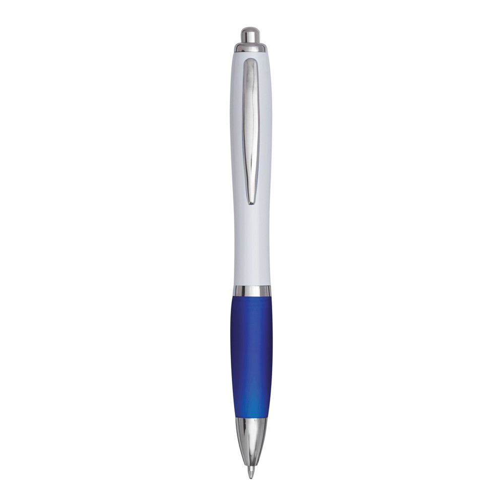 Kugelschreiber SWAYRABS: mit Schaft in taillierter Form aus recyceltem Kunststoff, gummierter Griffzone, Druckmechanismus, Großraummine, blauschreibend