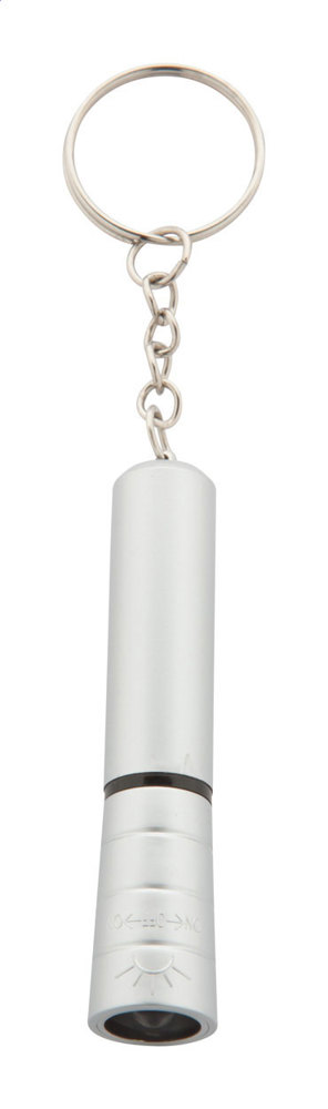 Mini-Taschenlampe aus Kunststoff mit weißem LED-Licht, Metallic-Oberfläche und Metall-Schlüsselring. Inkl. Knopfzellenbatterie.