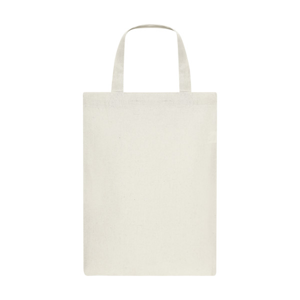 Tasche aus Baumwolle, natürliches Finish und 120g/m2. Genäht, mit kurzen verstärkten Griffen (30 x 2,5cm). Widerstandsfähigkeit bis zu 5 kg Gewicht.