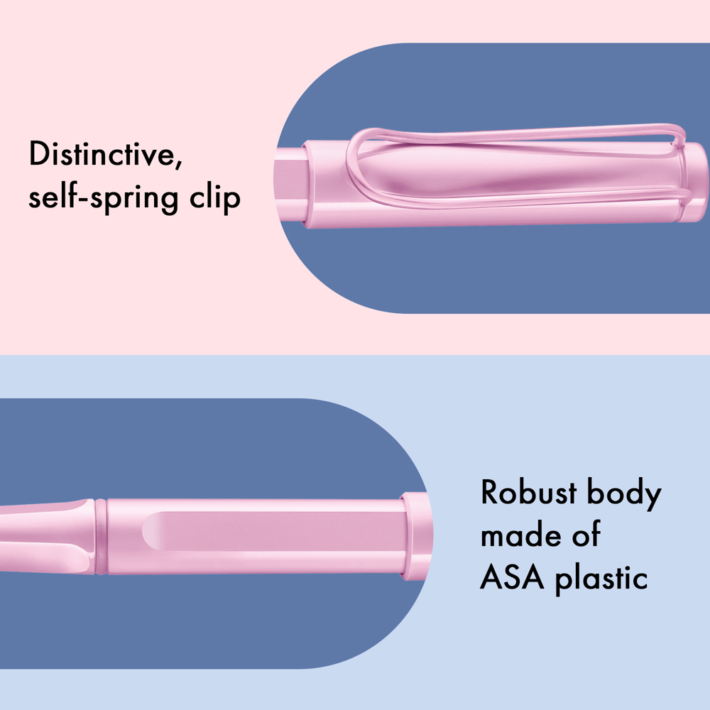 Der LAMY safari ist mehr als die Summe seiner Details: Er ist ästhetisch, robust und individuell. Der markante, selbstfedernde Clip hält das Schreibgerät sicher an Ort und Stelle befestigt. Das Gehäuse aus schlagzähem Kunststoff macht ihn zum robusten Begleiter in jedem Umfeld und die abgeflachte Form verhindert versehentliches Wegrollen. Funktionale Details wie subtil ergonomisch geformte Griffflächen und ein Sichtfenster zur Kontrolle des Tintenstands fügen sich wie selbstverständlich in das Design ein und machen den LAMY safari zum modernen Klassiker. Aus robustem ABS-Kunststoff, griffsympathisch durch markante Griffmulden, mit selbstfederndem Metallclip
