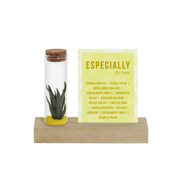 Bei dieser Variante steht ein einzelnes Glasfläschchen mit einer lebenden Mini-Sukkulente sicher auf einem Holzsockel, der mit einem Schlitz für eine lose A7-Karte versehen ist. Sowohl die Karte als auch der Holzblock können mit einem Logo, einer Botschaft oder einem individuellen Design personalisiert werden. Bei diesem Artikel ist die A7-Karte wie auf dem Foto standardmäßig enthalten. Möchtest du stattdessen eine eigene, personalisierte Karte in Vollfarbe hinzufügen? Wähle dann die Personalisierungsoption, du zahlst nur die Einrichtkosten für den Druck. Das Fläschchen enthält eine Schicht Sand oder farbigen Kies und bildet zusammen mit der Karte eine auffällige und bleibende Aufmerksamkeit.
